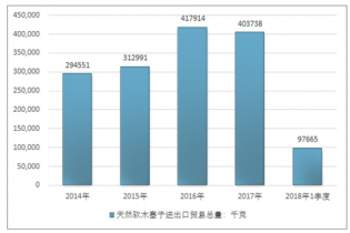 2014-2018年1季度天然軟木塞子出口貿(mào)易總量走勢圖(單位:千克)