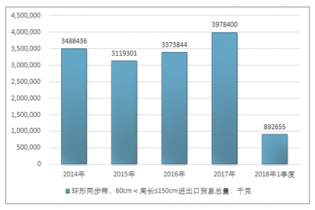 2016年我國環形同步帶,60cm<周長≤150cm進出口貿易總量3373844千克,2017年進出口貿易總量3978400千克;2019年1季度進出口貿易總量892655千克。