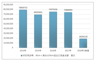 2016年我國環形同步帶,60cm<周長≤150cm進出口貿易總額74979336美元,2017年進出口貿易總額73886984美元;2019年1季度進出口貿易總額18293120美元。