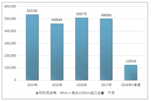 2016年我國環形同步帶,60cm<周長≤150cm進口總量506775千克,2017年進口總量498583千克;2019年1季度進口總量123516千克。