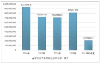 2016年我國新的充氣橡膠輪胎進(jìn)口總額706299065美元,2017年進(jìn)口總額815401679美元;2019年1季度進(jìn)口總額207228212美元。
