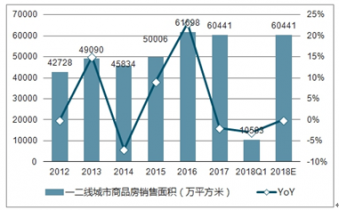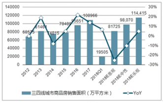 總體來看,由于去庫存、去杠桿已經(jīng)取得了一定成效,同時目前去化速度出現(xiàn)了放緩的跡象,短期內(nèi)房地產(chǎn)調(diào)控政策依然難以松動。分不同能級城市來看,一二線城市目前量價控制較為平穩(wěn),預(yù)計整體市場環(huán)境有望延續(xù)至 2018 年全年。因此,根據(jù) 2018 年一季度的商品房銷售情況,預(yù)計, 一二線城市成交水平在 2018 年維持 2017 年水平,即商品房銷售面積約 6.04 億平方米,銷售金額約 6.91 萬億元。
