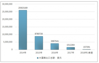 2014-2018年1季度木屑棒出口貿(mào)易總額走勢圖(單位:美元)