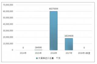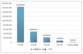 2014-2018年1季度木屑棒出口貿(mào)易總量走勢圖(單位:千克)