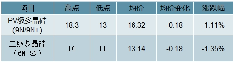 硅片價格持續(xù)下跌。本周156mm多晶太陽能硅片、156mm高效多晶太陽能硅片均價分別報于0.526和0.532美元,分別下跌1.13%和1.12%。156mm單晶太陽能硅片均價報于0.632美元,下跌3.22%。