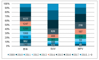 2009-2018年中國(guó)汽車細(xì)分市場(chǎng)銷量對(duì)比(單位:萬輛)