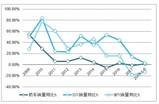 2009-2018年中國汽車細(xì)分市場銷量增速對比(單位:%)