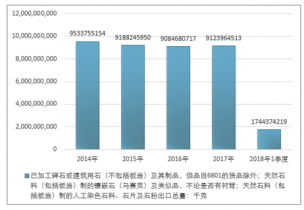 2016年我國已加工碑石或建筑用石(不包括板巖)及其制品,但品目6801的貨品除外;天然石料(包括板巖)制的鑲嵌石(馬賽克)及類似品,不論是否有襯背;天然石料(包括板巖)制的人工染色石料、石片及石粉出口總量9084680717千克 ,2017年出口總量9123964513千克 ;2019年1季度出口總量1744374219千克 。