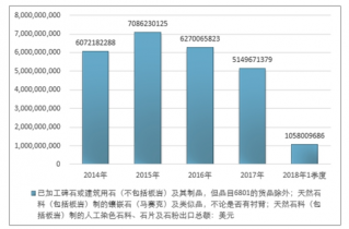 2016年我國已加工碑石或建筑用石(不包括板巖)及其制品,但品目6801的貨品除外;天然石料(包括板巖)制的鑲嵌石(馬賽克)及類似品,不論是否有襯背;天然石料(包括板巖)制的人工染色石料、石片及石粉出口總額6270065823美元,2017年出口總額5149671379美元;2019年1季度出口總額1058009686美元。