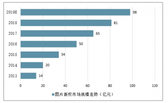2013-2019年中國圖片版權(quán)市場規(guī)模走勢(億元)