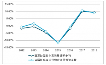 全國鐵路完成貨物發(fā)送量增速及國家鐵路貨物發(fā)送量增速走勢