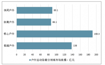 2017年中國戶外運(yùn)動各細(xì)分領(lǐng)域市場規(guī)模(單位:億元)