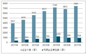 2011-2017年水泥制品制造行業企業個數及虧損企業單位數(家)