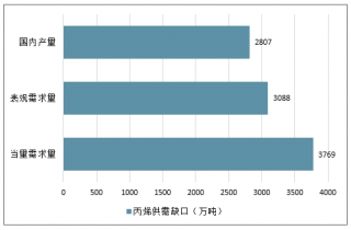 事實(shí)上中國(guó)每年仍要進(jìn)口大量的丙烯單體及其下游產(chǎn)品,其中聚丙烯缺口最大。如果從丙烯下 游衍生物需求量折算成的丙烯當(dāng)量需求來(lái)看,中國(guó)的丙烯需求缺口還是相當(dāng)大的。根據(jù) 2017年中國(guó) 主要丙烯衍生物的表觀需求折算而成的丙烯當(dāng)量需求量為 3769 萬(wàn)噸,國(guó)內(nèi)丙烯產(chǎn)量 2807 萬(wàn)噸僅僅 占到丙烯當(dāng)量需求的 75%,供需缺口達(dá)到 962 萬(wàn)噸,也就是說(shuō)約四分之一的丙烯和丙烯衍生物依賴 進(jìn)口。如下圖所示: