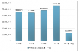 2016年我國砂布進出口貿易總量48295686千克 ,2017年進出口貿易總量55648755千克 ;2019年1季度進出口貿易總量12922984千克 。