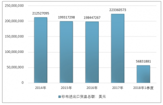 2016年我國砂布進出口貿易總額198447267美元,2017年進出口貿易總額223360573美元;2019年1季度進出口貿易總額56831881美元。