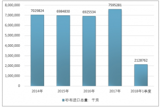 2016年我國砂布進口總量6925534千克 ,2017年進口總量7595281千克 ;2019年1季度進口總量2128762千克 。
