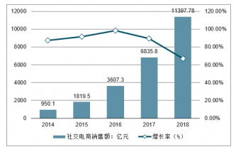 2014-2018年中國(guó)社交電商市場(chǎng)規(guī)模及增長(zhǎng)率走勢(shì)
