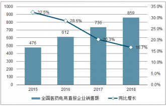 2015-2018年全國醫(yī)藥電商直報企業(yè)銷售額及增速