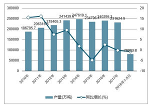 2010-2018年中國(guó)水泥產(chǎn)量及增長(zhǎng)走勢(shì)