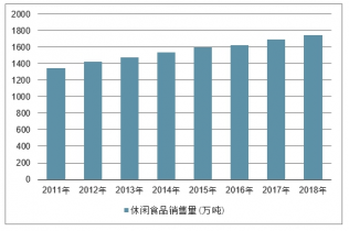 2011-2018年中國(guó)休閑食品銷(xiāo)售量走勢(shì)(萬(wàn)噸)