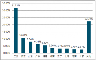 2017年,江蘇省銷售收入比重最大,占全行業比例超過三成,是我國永磁電機行業的最主要集聚區;其次是浙江省,占比達到10.81%;山東省排在第三,占比8.04%;其余省份占比均在6.5%以下。