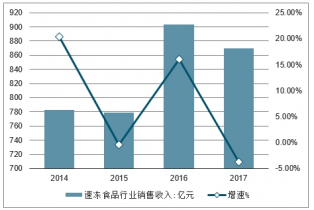 2014-2017年中國(guó)速凍食品行業(yè)銷售收入及增速走勢(shì)