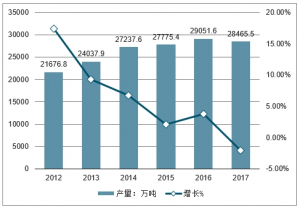 飼料行業(yè)是現(xiàn)代畜牧業(yè)和水產養(yǎng)殖業(yè)發(fā)展的物質基礎,同時連接著種植業(yè),是農業(yè)產業(yè)鏈中的重要環(huán)節(jié)。從近六年中國飼料產量來看:2012-2015年飼料產量增速有所回落,2016年增速開始上升。其中2016年中國飼料產量為29051.6萬噸,同比增長3.8%;2017年中國飼料產量達到28465.5萬噸,飼料產量稍有下降。