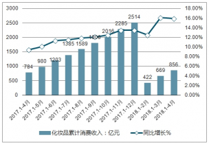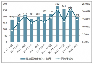 2019年4月份化妝品消費收入196億元,與去年同期增長15.1%。2019年1-4月中國化妝品累計消費收入達856億元,同比增加15.9%