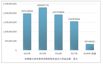 2016年我國(guó)塑像及其他裝飾用陶瓷制品進(jìn)出口貿(mào)易總額1917378934美元,2017年進(jìn)出口貿(mào)易總額1547874054美元;2019年1季度進(jìn)出口貿(mào)易總額337146351美元。