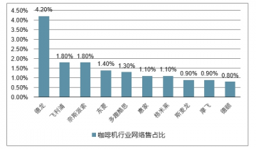 從咖啡機網絡零售情況來看,2019年3月咖啡機網絡零售TOP10品牌分別是:德龍、飛利浦、奈斯派索、東菱、多趣酷思、惠家、格米萊、斯麥龍、摩飛以及德頤。其中,德龍品牌咖啡機市場占比最大,3月其網絡零售市場份額占比達到4.2%。此外,飛利浦和奈斯派索品牌咖啡機擠進榜單前三,市場份額占比均為1.8%。