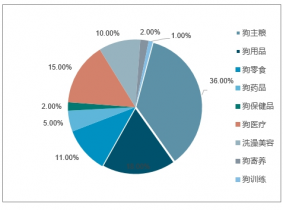 狗商品消費占比72%,其中主糧占比最高,約為36%。