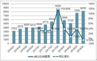 2016-2018年AMOLE面板銷售額及增速