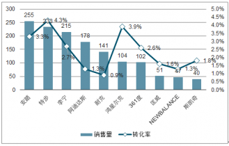 2019年一季度安踏、特步和李寧的銷量均達到200萬件以上,安踏的銷售最大,達到255萬件,特步為233萬件,李寧的數(shù)量為215萬件。這三大品牌中,特步的線上轉(zhuǎn)化率最高,達到4.30%,安踏次之,為3.30%,李寧的轉(zhuǎn)化率為2.70%。