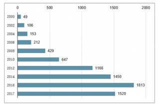 2000-2017年我國汽車塑料件技術(shù)專利申請數(shù)量
