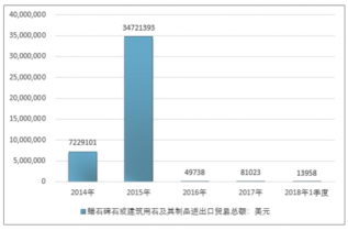 2016年我國蠟石碑石或建筑用石及其制品品進出口貿易總額49738美元,2017年進出口貿易總額81023美元;2019年1季度進出口貿易總額13958美元。