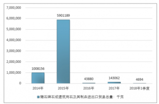 2016年我國蠟石碑石或建筑用石及其制品品進出口貿易總量43880千克 ,2017年進出口貿易總量143062千克 ;2019年1季度進出口貿易總量4694千克 。