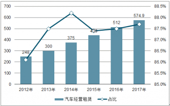 2012-2017年我國汽車經(jīng)營租賃市場規(guī)模及在整體市場中的占比變化(億元)