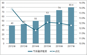 2012-2017年中國汽車金融租賃市場規(guī)模及占在整體市場中的占比變化(億元)