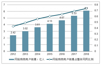 2012-2018年中國網絡購物用戶規模及占整體網民比例走勢