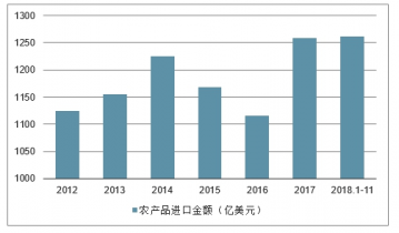 2017年1-12月,我國農產品進口額1258.6億美元,同比增長12.8%。2019年1-11月,我國農產品進口額1261.6億美元,同比增長10.5%。