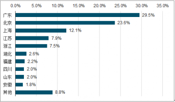 從服務(wù)機器人企業(yè)分布領(lǐng)域來看,中國服務(wù)機器人多分布在廣東、上海、江蘇等沿海地區(qū),其中,多集中于廣東、北京、上海,三者企業(yè)數(shù)量占比分別為29.5%、23.6%、12.1%;此外,江蘇、浙江占比分別為7.9%和7.5%,均排在靠前位置。