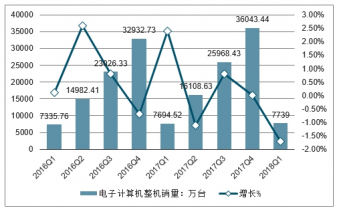 2019年Q1中國電子計算機整機銷量累計達7739.2萬臺,產銷率同比下降1.7%,庫存比年初增長37.1%;2017年中國電子計算機整機銷量累計達36043.44萬臺,產銷率同比增長0%,庫存比年初增長25.7%。2019年Q2中國電子計算機整機銷量累計達16408.85萬臺,產銷率同比下降1.6%,庫存比年初增長1.1%;
