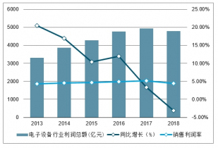 2013-2018年中國電子設(shè)備行業(yè)銷售利潤(rùn)率、利潤(rùn)總額及同比增長(zhǎng)走勢(shì)