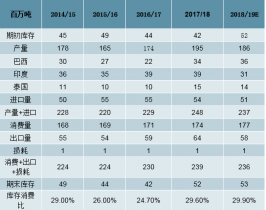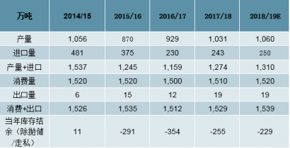 外糖價(jià)格低迷,國(guó)內(nèi)進(jìn)口量可控:2018/19榨季全球食糖庫(kù)存消費(fèi)比同比升0.3個(gè)百分點(diǎn)至29.9%,處于歷史較高水平,預(yù)計(jì)國(guó)際糖價(jià)仍在低位徘徊。當(dāng)前我國(guó)食糖實(shí)行進(jìn)口配額制度,年配額194.5萬(wàn)噸,配額內(nèi)關(guān)稅15%,配額外關(guān)稅50%。但自2017年5月22日起,中國(guó)對(duì)食糖配額進(jìn)口征收保障性關(guān)稅,實(shí)施期限為三年,三年期間保障措施關(guān)稅稅率分別為45%、40%、35%,令配額外食糖進(jìn)口成本大增。綜合考慮兩方面因素,我們判斷當(dāng)前我國(guó)食糖進(jìn)口量仍可控,預(yù)計(jì)2018/19進(jìn)口可達(dá)250萬(wàn)噸。