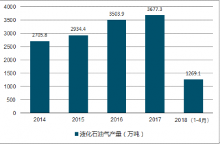 2019年1-4月中國(guó)液化石油氣產(chǎn)量為1269.1萬(wàn)噸,同比增長(zhǎng)7.9%;2017年1-12月中國(guó)液化石油氣產(chǎn)量為3677.3萬(wàn)噸,同比增長(zhǎng)4.5%。