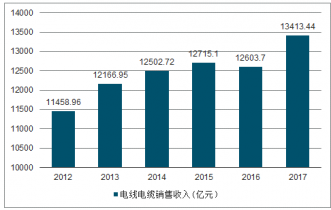 2017中國電線電纜行業(yè)銷售收入為13413.44億元,比2016年增長809.74億元。