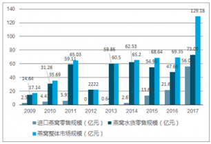 2017年我國燕窩行業整體市場規模約129.18億元,其中進口燕窩零售市場規模約56.09億元,燕窩水貨零售市場規模約73.09億元。