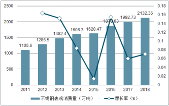 2011-2018年不銹鋼粗鋼產(chǎn)量規(guī)模及增長率情況