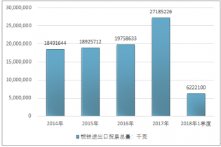 2016年我國鈮鐵進出口貿易總量19758633千克 ,2017年進出口貿易總量27185226千克 ;2018年1季度進出口貿易總量6222100千克 。